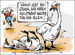 Unter Stornos kurzfristiger Buchungen leiden alle Rügener Beherbergungsbetriebe, berichtet Raymond Kiesbye, Geschäftsführer der Tourismuszentrale. Während Hotels und Ferienwohnungen nahe der Hauptfundorte toter Vögel auf Wittow und Ummanz im Norden der Insel sogar "dramatische Einbußen" erlitten hätten, verzeichne die Rügener Bäderküste im Südosten zwischen Binz und Göhren nur moderate Rückgänge. Auffällig oft, so Kiesbye, sind Familien mit Kindern stark verstört. Sie befürchten, dass sich die Kleinen beim Spielen am Strand mit dem Vogelgrippevirus infizieren könnten. "Umso wichtiger ist es, dass jetzt gründlich aufgeräumt wird", betont er, der sich allerdings einen weniger martialischen Auftritt der Bundeswehr gewünscht hätte.